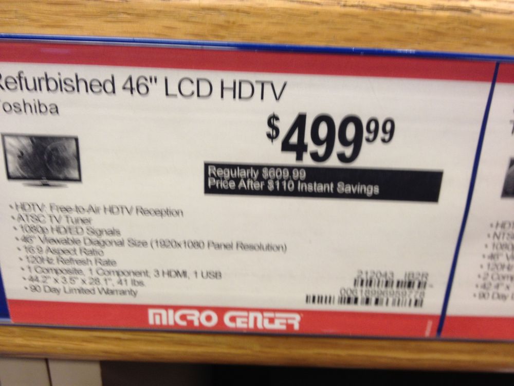 That Sunday, I wandered into Microcenter, an electronics store near my house, and saw a great deal – a 46″ Toshiba television with a 120 Hz refresh rate, 3 HDMI ports (one for the TiVo, one for the Apple TV, and one to grow on), all for just $500. Why so cheap? Because it was on sale… and it was refurbished.