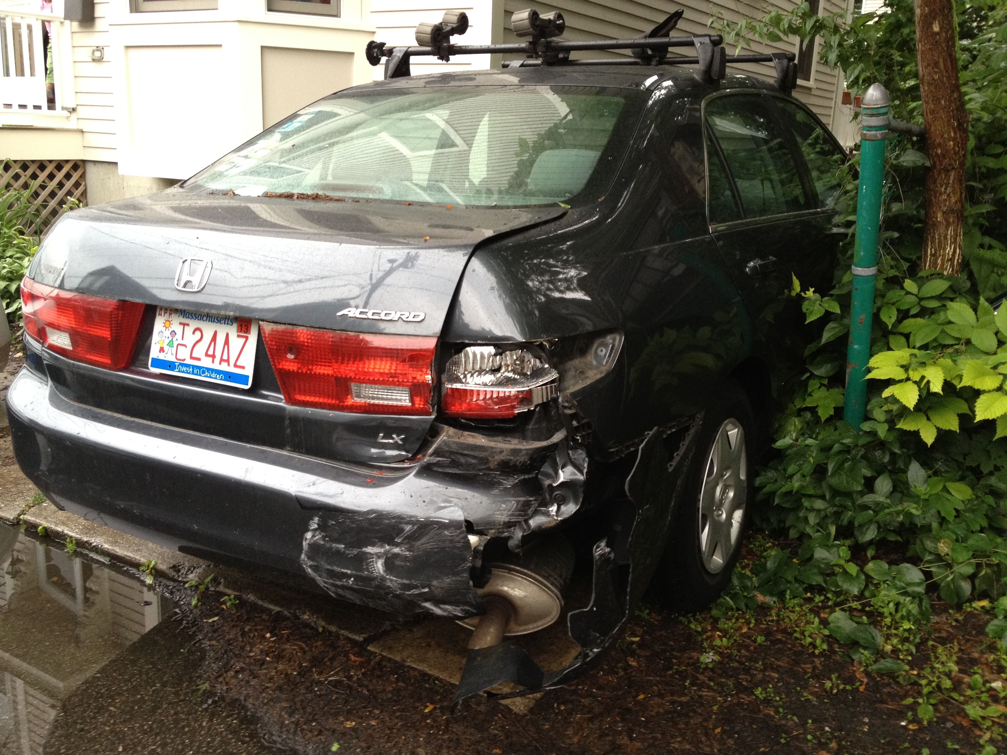 Yesterday on the way home from work, I was rear-ended. I stopped at a light when I realized I was not going to make it before it turned red, and the driver behind me was hoping to follow me through and clipped the corner of my car. We were both fine, but the right rear corner of my car was pretty smashed up.