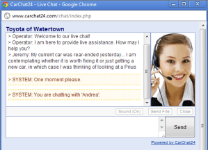 My last experience with using a live chat was Verizon’s about 18 months ago, and it was pretty dismal. Whatever was at the other end wasn’t able to answer even basic questions, making me doubt whether I was really talking to a person at the other end, but I figured I would give Toyota’s a try. I hit the button to initiate a live chat and then typed my question. The system paused for a moment, then informed that I was talking to “Andrea”.