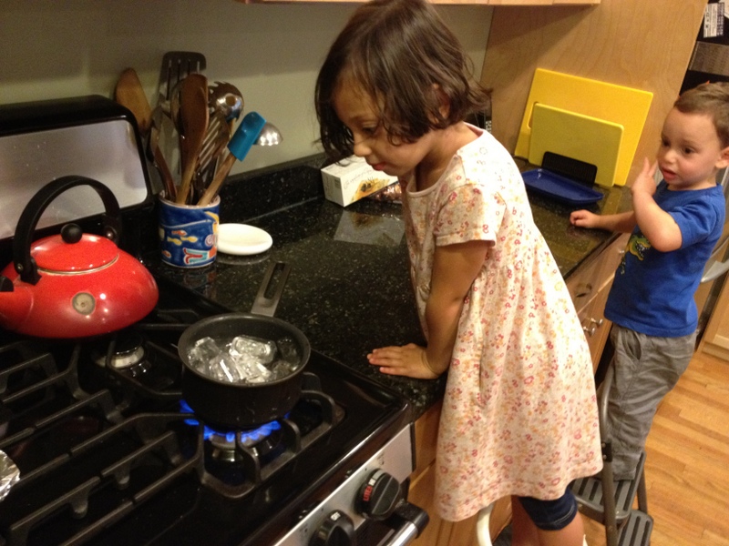 Next, it was time to turn it back into water. We took all of the ice cubs out of the tray, put them in a pot, and started heating it up on the stove.