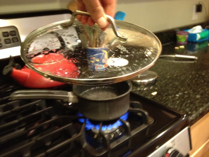 This failure inspired me to come up with something much simpler for the actual run-through with my daughter. I took a glass pot top and put it in the freezer to cool it down. We brought the melted ice water to a boil, and then I simply held the chilled pot top about six inches over the pot.