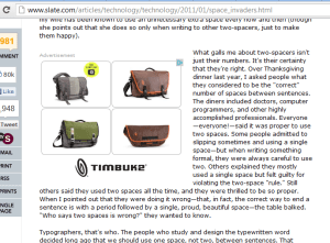 Now, this certainly could be a big coincidence.  I haven’t done any experiments with fresh browsers to see if they will track me.  Still, the timing is very suspicious to me.  I’m guessing that because I spent time reviewing a product on their site but never made it to checkout, they have some sort of ad network cookie that puts in me into a “hot lead” category.  Then, as I browse the web and visit sites that use the ad network, they see “ooh, this is a timbuk2 hot lead – show him the timuk2 ad.”
