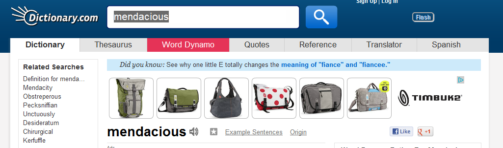 The next day, back at work, I started noticing that Timbuk2 ads are showing up everywhere. I went to look up “mendacious”, and there it was, staring at me: