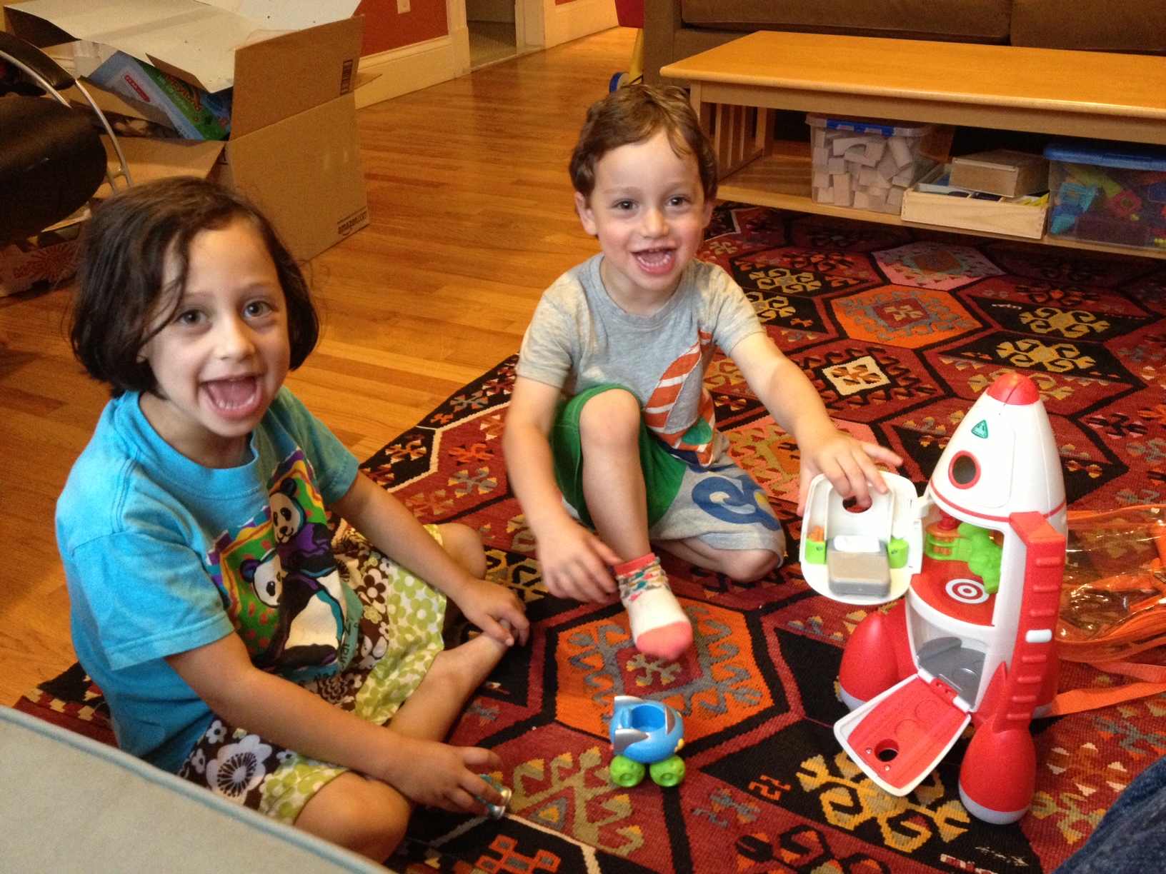 Back home in Cambridge, I stumbled onto a toy that wasn’t quite what I was looking for but met my requirements.  When my son was having a hard time letting me leave at his day care, I was talking him about pretending to take a trip to the moon.  One of the teachers went into a closet and pulled out a rocket ship toy to distract him.  It was in rough shape from many years of kids playing with it, but I realized it was what I wanted.  I went online and ordered one for my son for his birthday (as a gift from his grandparents).