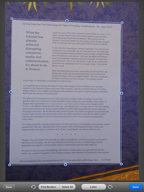 The magic is in the automatic edge detection.  You just set the page down on a surface, make sure you can see it on the screen, and hit the capture button.  You don’t need to worry about it being lined up well.  Scanner Pro automatically spots the edges of the document and marks them for you.  You can make some adjustments if it didn’t get it right, but I have found it to be well over 95% accurate.