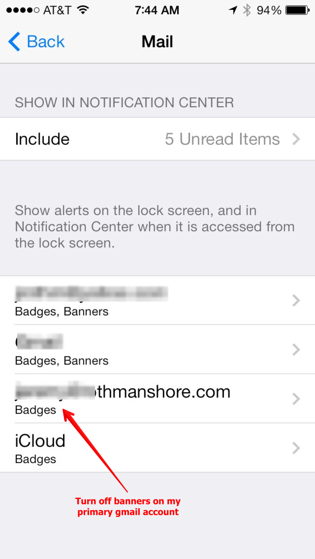 I don’t want to disable notifications for the Mail app altogether, since I do want to get the notified when a message pops in from when of my secondary email boxes. The solution is that iOS actually allows you to set custom Notification Center options for each email account separately:
